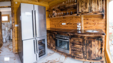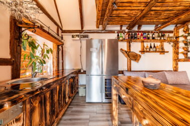 - Dnevni boravak sa trosedom na razvlačenje i dve fotelje i kompletno opremljenom kuhinjom i kombinovanim frižiderom sa odeljkom za hlađenje vina i pratećim kuhinjskim aparatima.